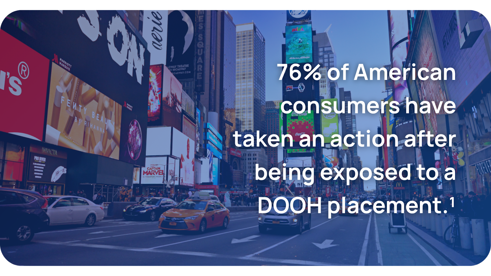 Research by the Out of Home Advertising Association of America (OAAA) found that 76% of American consumers have taken an action after being exposed to a DOOH placement.¹ It brings together the reach and cultural impact of traditional OOH with the flexibility, targeting, and accountability of digital media.